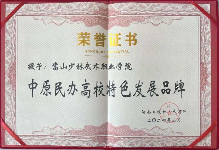 近日,由河南日报社·大河网主办的河南省第二届民办高校舆论宣传与品牌建设创新发展研讨会在郑州升达经贸管理学院召开。在此次研讨会上,嵩山少林武术职业学院荣获“中原民办高校特色发展品牌”荣誉称号。