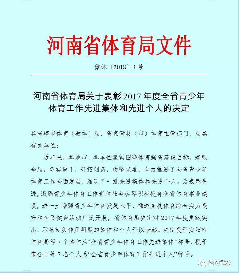 郑州少林塔沟教育集团荣获2017年度河南省 青少年体育工作先进集体荣誉称号 2018年1月10日,河南省体育局下发豫体【2018】3号文件,对2017年度河南省青少年体育工作先进集体和先