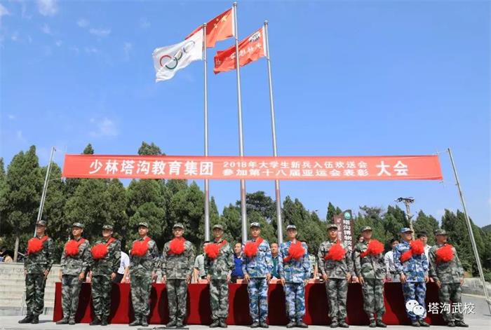 塔沟教育集团表彰亚运冠军 欢送入伍新兵 2018年9月11日上午,郑州少林塔沟教育集团三万师生隆重集会,对在第十八届亚运会上为中国代表团夺得金牌的三位运动员予以表彰,同时欢送12