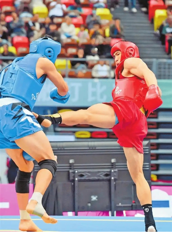 11月16日,在第十五届全运会散打项目中,河南选手王少华(右)夺得男子90公斤级项目金牌。