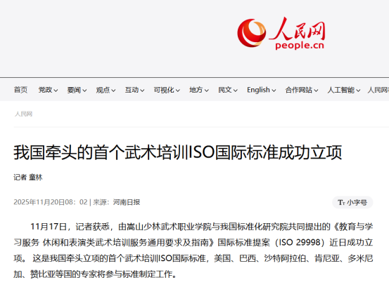 【人民网】少林塔沟教育集团:我国牵头的首个武术培训ISO国际标准成功立项